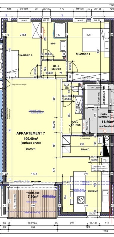 Situé au premier étage du premier immeuble du Clos du Parc, l'appartement "A7" (+/-100,40 m² brut hors terrasse selon plan) est composé d'un hall d'entrée, d'un lumineux séjour avec un espace cuisine ouvert et accès direct vers la terrasse à rue orientée sud-ouest, wc indépendant, buanderie, salle de douches et deux chambres.