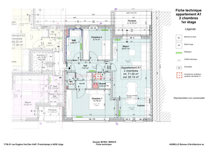 Appartement "A1" ( +/- 72 m² d'après plans d'architecte) situé au 1er étage composé d'un hall d'entrée avec espace vestaire et toilette indépendante, séjour traversant (+/- 29 m²) comprenant l'espace cuisine et l'accès à une terrasse privative de +/- 9 m², buanderie, salle de bains (douche, meuble évier et wc) et 2 chambres (+/- 9 et 14 m²). L'appartement fait partie de la Résidence Vandenhoff qui bénéficie d’une proximité directe avec un magasin d’alimentation, une pharmacie, une boulangerie, le TEC, divers services de restauration, etc. Au coin de la Rue E. Vandenhoff et de la rue Fraischamps, tous les appartements de la résidence bénéficient individuellement d'une terrasse, d'une cave et d'un garage ou emplacement voiture intérieur. Les habitants profiteront de deux espaces vélos sécurisés, une cour commune et un local poubelles. Les appartements sont vendus totalement parachevés dont peintures et cuisines hyper équipées ! Châssis PVC double vitrage, chauffage au gaz de ville (chaudières à condensation individuelles), ventilation C+. Compteurs individuels (eau, gaz, électricité). Les prix affichés sont hors frais et hors TVA (TVA 21%, frais de raccordements, honoraires notariaux et quote-part d’acte de base). Référence PEB : RWPEB-129366. Livraison prévue au printemps 2026. Plus d'informations disponibles sur demande à info@waucomont.be. Informations données à titre indicatif et non contractuelles. www.waucomont.be
