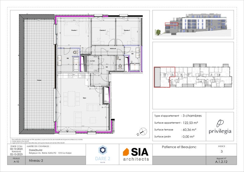 ACTION BATIBOUW - Cuisine équipée et appareils sanitaires offerts (valable pour tout engagement avant le 31 mars 2026) ! Projet exceptionnel érigé à proximité de l'hôpital du MontLégia! Privilégia vous propose cet APPARTEMENT 3CH (+/- 122 m² d'après plan) situé au 2ème étage: spacieux hall d'entrée, séjour avec cuisine ouverte et une baie de fenêtre s'ouvrant vers une terrasse orientée Nord-Est (+/- 60 m²), 3 chambres dont une avec salle de bains et wc, salle de bains, local technique/buanderie et wc indépendant. L'appartement est vendu achevé à l'exception des peintures et luminaires (cuisine incluse). Des emplacements de parking en sous-sol et des caves sont proposés en supplément. Néanmoins, de spacieux espaces sécurisés et aménagés sont disponibles et libre d'accès aux occupants pour les vélos. Chauffage sol et rafraîchissement via un réseau de chaleur (alternative écologique aux climatisations actuelles), compteurs individuels (eau et électricité), châssis double vitrage PVC, ventilation double flux, porte d'entrée individuelle anti-effraction, vidéophone. Référence PEB: RWPEB-135259. Prix hors frais (TVA 21%, droits d'enregistrements sur le terrain, frais de raccordements, honoraires notariaux et frais d'acte de base). N'hésitez pas à nous contacter pour fixer une visite ! Plus d'informations disponibles sur demande à info@waucomont.be. Informations données à titre indicatif et non contractuelles. www.waucomont.be