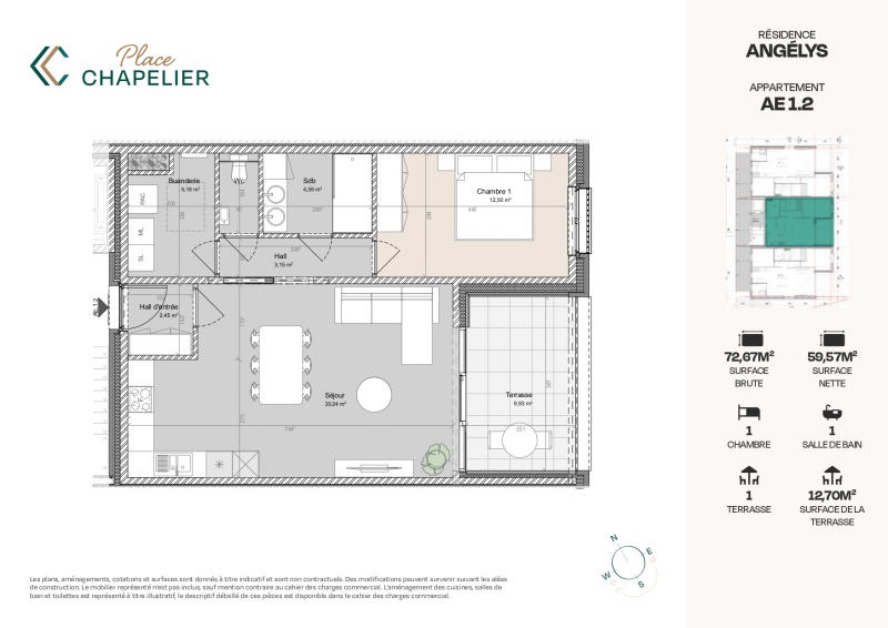 Accessible via la Rue de la Clef, la Résidence Angélys propose 13 appartements dont celui-ci situé au 1er étage le "E 1.2" de +/- 72 m² (surface brute) avec un extérieur de +/- 12 m² (surface nette). PLAN SUR DEMANDE. Certifiée PEB A+, la résidence répond aux normes les plus exigeantes en matière de performances énergétiques, ce qui permet d'assurer un confort de vie optimal et une consommation énergétique insignifiante. Nombreux parkings intérieurs et extérieurs disponibles ainsi que des caves individuelles. Parking vélos. Les appartements sont vendus achevés (hors peinture et luminaires). Les cuisines de qualité sont équipées et comprises dans le prix de vente. Pompe à chaleur individuelle, chauffage sol, ventilation double flux et compteurs séparés (eau et électricité). Référence PEB: RWPEB-105439. Prix hors frais (TVA 21%, droits d'enregistrement sur la quotité terrain, frais de raccordements, honoraires notariaux et frais d'acte de base). RC non attribué. N'hésitez pas à nous contacter pour fixer une visite ! Plus d'informations disponibles sur demande à info@waucomont.be. Informations données à titre indicatif et non contractuelles. www.PLACECHAPELIER.be
