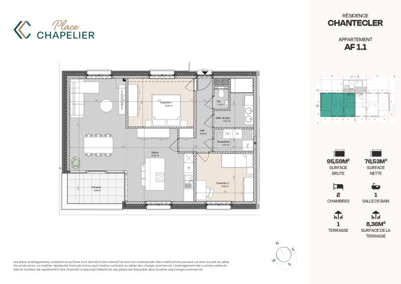 Accessible via la rue de la Clef, la Résidence Chantecler propose 7 appartements dont celui-ci situé au rez-de-chaussée, le "F 1.1", de +/- 95 m² (surface brute) avec un extérieur de +/- 8 m² (surface nette). PLAN SUR DEMANDE. Certifiée PEB A+, la résidence répond aux normes les plus exigeantes en matière de performances énergétiques, ce qui permet d'assurer un confort de vie optimal et une consommation énergétique insignifiante. Nombreux parkings intérieurs et extérieurs disponibles ainsi que des caves individuelles. Parking vélos. Les appartements sont vendus achevés (hors peinture et luminaires). Les cuisines de qualité sont équipées et comprises dans le prix de vente. Pompe à chaleur individuelle, chauffage sol, ventilation double flux et compteurs séparés (eau et électricité). Référence PEB: RWPEB-105439. Prix hors frais (TVA 21%, droits d'enregistrement sur la quotité terrain, frais de raccordements, honoraires notariaux et frais d'acte de base). RC non attribué. N'hésitez pas à nous contacter pour fixer une visite ! Plus d'informations disponibles sur demande à info@waucomont.be. Informations données à titre indicatif et non contractuelles. www.PLACECHAPELIER.be