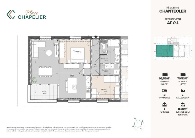 Accessible via la rue de la Clef, la Résidence Chantecler propose 7 appartements dont celui-ci, situé au 2ème étage, le "F 2.1" de +/- 95 m² (surface brute) avec un extérieur (terrasse) de +/- 8 m² (surface nette). PLAN SUR DEMANDE. Certifiée PEB A+, la résidence répond aux normes les plus exigeantes en matière de performances énergétiques, ce qui permet d'assurer un confort de vie optimal et une consommation énergétique insignifiante. Nombreux parkings intérieurs et extérieurs disponibles ainsi que des caves individuelles. Parking vélos. Les appartements sont vendus achevés (hors peinture et luminaires). Les cuisines de qualité sont équipées et comprises dans le prix de vente. Pompe à chaleur individuelle, chauffage sol, ventilation double flux et compteurs séparés (eau et électricité). Référence PEB: RWPEB-105439. Prix hors frais (TVA 21%, droits d'enregistrement sur la quotité terrain, frais de raccordement, honoraires notariaux et frais d'acte de base). RC non attribué. N'hésitez pas à nous contacter pour fixer une visite ! Plus d'informations disponibles sur demande à info@waucomont.be. Informations données à titre indicatif et non contractuelles. www.PLACECHAPELIER.be