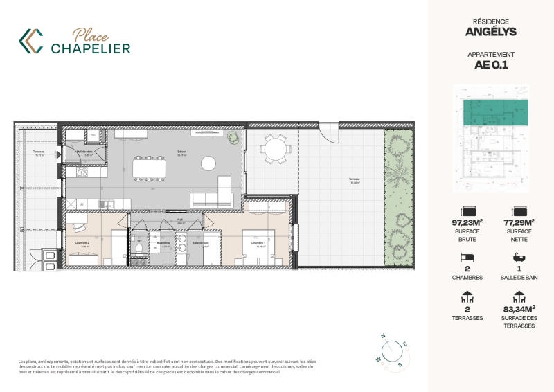 Accessible via la rue de la Clef, la Résidence Angélys propose 13 appartements dont celui-ci situé au rez-de-chaussée, le "E 0.1" de +/- 97 m² (surface brute) avec un extérieur de +/- 83m² (surface nette). PLAN SUR DEMANDE. Certifiée PEB A+, la résidence répond aux normes les plus exigeantes en matière de performances énergétiques, ce qui permet d'assurer un confort de vie optimal et une consommation énergétique insignifiante. Nombreux parkings intérieurs et extérieurs disponibles ainsi que des caves individuelles. Parking vélos. Les appartements sont vendus achevés (hors peinture et luminaires). Les cuisines de qualité sont équipées et comprises dans le prix de vente. Pompe à chaleur individuelle, chauffage sol, ventilation double flux et compteurs séparés (eau et électricité). Référence PEB: RWPEB-105439. Prix hors frais (TVA 21%, droits d'enregistrement sur la quotité terrain, frais de raccordements, honoraires notariaux et frais d'acte de base). RC non attribué. N'hésitez pas à nous contacter pour fixer une visite ! Plus d'informations disponibles sur demande à info@waucomont.be. Informations données à titre indicatif et non contractuelles. www.PLACECHAPELIER.be