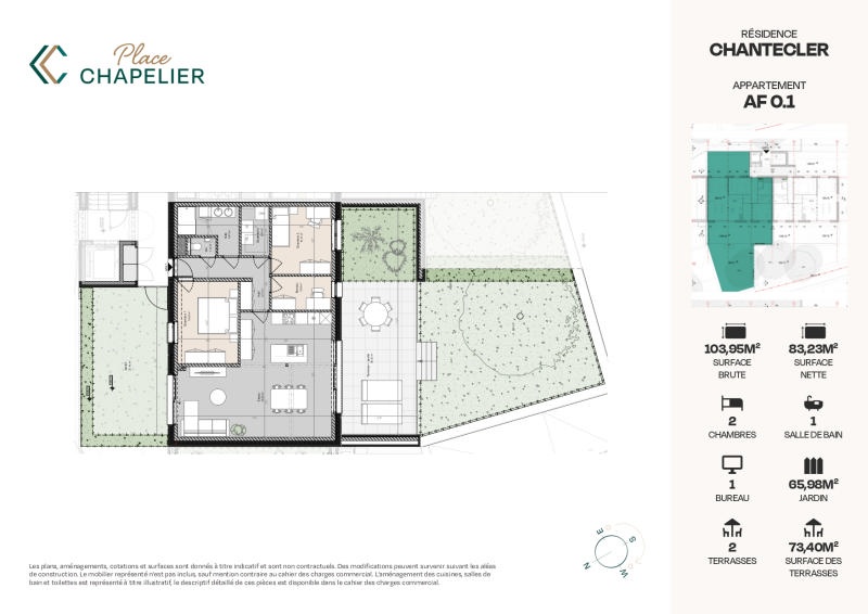 Accessible via la rue de la Clef, la Résidence Chantecler propose 7 appartements dont celui-ci situé au rez-de-chaussée, le "F 0.1", de +/- 104 m² (surface brute) avec un extérieur de +/- 139 m² (surface nette). PLAN SUR DEMANDE. Certifiée PEB A+, la résidence répond aux normes les plus exigeantes en matière de performances énergétiques, ce qui permet d'assurer un confort de vie optimal et une consommation énergétique insignifiante. Nombreux parkings intérieurs et extérieurs disponibles ainsi que des caves individuelles. Parking vélos. Les appartements sont vendus achevés (hors peinture et luminaires). Les cuisines de qualité sont équipées et comprises dans le prix de vente. Pompe à chaleur individuelle, chauffage sol, ventilation double flux et compteurs séparés (eau et électricité). Référence PEB: RWPEB-105439. Prix hors frais (TVA 21%, droits d'enregistrement sur la quotité terrain, frais de raccordements, honoraires notariaux et frais d'acte de base). RC non attribué. N'hésitez pas à nous contacter pour fixer une visite ! Plus d'informations disponibles sur demande à info@waucomont.be. Informations données à titre indicatif et non contractuelles. www.PLACECHAPELIER.be