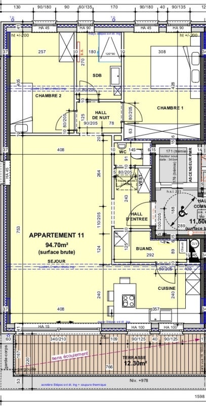 Situé au troisième étage du premier immeuble du Clos du Parc, l'appartement "A2" (+/-100,40 m² brut hors terrasse selon plan) est composé d'un hall d'entrée, d'un lumineux séjour avec un espace cuisine ouvert et accès direct vers la terrasse à rue orientée sud-ouest, wc indépendant, buanderie, salle de douches et deux chambres.