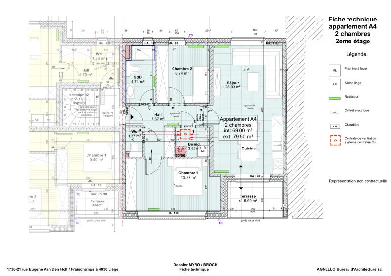 Penthouse "A4" ( +/- 69 m² d'après plans d'architecte) situé au 2ème étage composé d'un hall d'entrée avec espace vestaire et toilette indépendante, séjour traversant (+/- 28 m²) comprenant l'espace cuisine et l'accès à une terrasse privative de +/- 6 m², buanderie, salle de bains (douche, meuble évier et wc) et 2 chambres (+/- 9 et 14 m²). L'appartement fait partie de la Résidence Vandenhoff qui bénéficie d’une proximité directe avec un magasin d’alimentation, une pharmacie, une boulangerie, le TEC, divers services de restauration, etc. Au coin de la Rue E. Vandenhoff et de la rue Fraischamps, tous les appartements de la résidence bénéficient individuellement d'une terrasse, d'une cave et d'un garage ou emplacement voiture intérieur. Les habitants profiteront de deux espaces vélos sécurisés, une cour commune et un local poubelles. Les appartements sont vendus totalement parachevés dont peintures et cuisines hyper équipées ! Châssis PVC double vitrage, chauffage au gaz de ville (chaudières à condensation individuelles), ventilation C+. Compteurs individuels (eau, gaz, électricité). Les prix affichés sont hors frais et hors TVA (TVA 21%, frais de raccordements, honoraires notariaux et quote-part d’acte de base). Référence PEB : RWPEB-129366. Livraison prévue au printemps 2026. Plus d'informations disponibles sur demande à info@waucomont.be. Informations données à titre indicatif et non contractuelles. www.waucomont.be