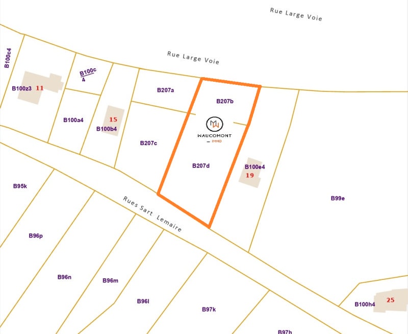 Bien située sur les hauteurs de Tilff, belle parcelle de terrain (LOT 2 dans les photos) de +/- 1.576 m² en zone d'habitat accessible par 2 rues. Largeur façade à rue (rue Large Voie) : +/- 25 m et largeur façade à rue (rue Sart Lemaire) : +/- 27 m. Libre de constructeur! Cette parcelle ne fait pas partie d'un lotissement mais d'une division, il n'y a donc pas de prescriptions urbanistiques propres à un lotissement; il faudra toutefois respecter les prescriptions en vigueur (communale, régionale, ...). Tous les impétrants et raccordements (électricité, eau, traitement des eaux usées et pluviales, ...) et les éventuelles charges urbanistiques (frais de viabilisation, trottoir éventuel, ) sont à charge et aux frais de lacquéreur. Cette parcelle est située à 4130 Tilff, entre la rue Large Voie et la rue Sart Lemaire. Références cadastrales: Esneux, 2ème division Tilff, Section B, n°207D et 207B. A ne pas manquer! Informations données à titre indicatif et non contractuelles. www.waucomont.be