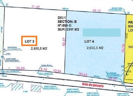 Belle parcelle de terrain (lot "3", représenté approximativement sur la photo), en grande majorité en zone d'habitat à carctère rural, d'une superficie d'environ 2.655m² avec une largeur de façade à rue d'environ 51m47 ! Ce terrain (destiné à récevoir une seule habitation) fait partie d'une division familiale et non d'un lotissement, il n'y a donc pas de prescriptions urbanistiques liées à un lotissement. Il y aura toutefois lieu de respecter les prescriptions en vigueur (communale, régionale, ...). Les frais liés à la viabilisation, aux impétrants (trottoir éventuel, électricité, eau, ...) et les clotures sont à charge des acquéreurs. Vente soumise à l'accord sur la division des autorités compétentes. Adresse: SOUMAGNE, rue du Peuple, en face du n°96. Magnifique situation ! Informations données à titre indicatif et non contractuelles. www.waucomont.be