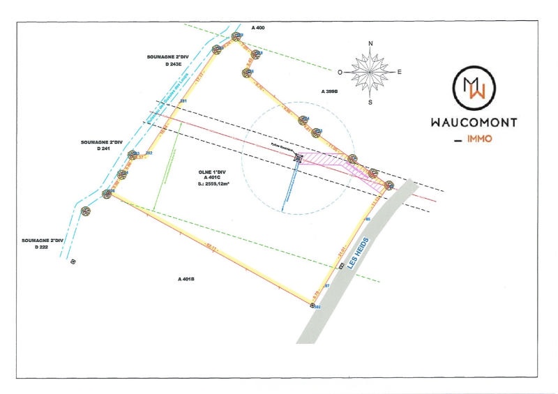 Magnifique parcelle de terrain denviron 2.550 m² en zone d'habitat à caractère rural et une petite partie en zone agricole à l'arrière du terrain, située dans un agréable endroit verdoyant à Olne. Largeur façade à rue: +/- 38 m. Cette parcelle est située à 4877 Olne, Les Heids, à gauche du n°12 au lieu-dit "Magnie Trou". Référence cadastrale : Olne, section A, n°401CP. Situation idéale : cadre calme et verdoyant. Libre de constructeur ! Le bien ne fait pas partie d'un lotissement, il y aura toutefois lieu de se conformer aux impositions urbanistiques en vigueur. A ne pas manquer ! Les limitations reprises sur les photos sont approximatives. Informations données à titre indicatif et non contractuelles. www.waucomont.be