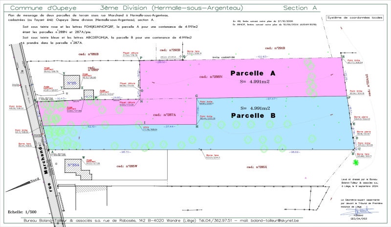 Idéalement situé dans un agréable quartier résidentiel très prisé, ensemble de 2 belles et spacieuses parcelles de terrain pour une superficie de 9.982 m² au total (+/- 4.991 m² chacune d'après plan de géomètre (parcelle A et parcelle B)). Belle situation, à la limite entre Hermalle-sous-Argenteau et Visé, à proximité du Halage et de toutes les commodités. Ces parcelles sont libres de constructeur et sont situées en zone d'habitat. Largeur à rue: environ 32 mètres, la largeur s'élargit ensuite. Le bien ne fait pas partie d'un lotissement (division familiale), il y aura toutefois lieu de se conformer aux impositions urbanistiques en vigueur. Prix demandé : 490.000 €. Références cadastrales: section A, n° 1419 A (pour la parcelle A) et section A, n° 1419 B (pour la parcelle B), anciennement: Oupeye/3ème division/ Hermalle-sous-Argenteau/Section A, n°287AP0000 et partie du n°288KP0000. Le tracé repris sur les photos est approximatif. Informations données à titre indicatif et non contractuelles. Belle situation! Au calme tout en étant à proximité de toutes les commodités! www.waucomont.be