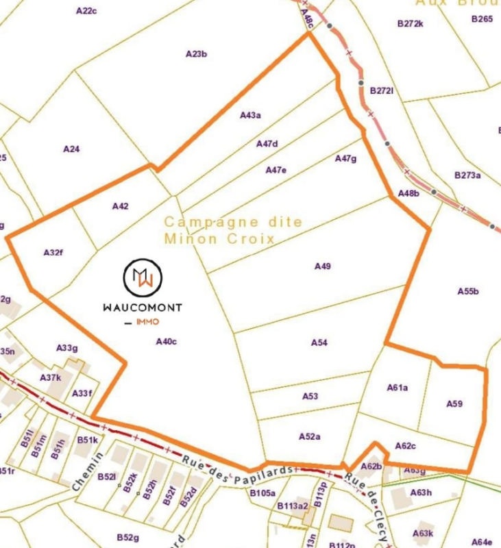 Idéal pour promoteurs, constructeurs, .... Vaste ensemble de parcelles de terrain (+/- 63.348 m² d'après matrice cadastrale) située en grande partie en zone d'habitat (quasi la totalité) situé à Queue-du-Bois (commune de Beyne-Heusay) dans un agréable endroit et offrant de magnifiques vues. Le bien est libre de constructeur. Références cadastrales: Beyne-Heusay, 2ème division, Queue-du-Bois, Section A, n°42, 53, 47D, 61A, 47E, 54, 49, 59, 43A, 47G, 62C, 32F, 40C, 52A. Adresse: 4610 Queue du Bois, rue des Papillards en face des numéros 29 et 37. La ligne électrique apparaissant sur le plan de secteur a été supprimée. Nous vous renvoyons également à la lecture du Schéma directeur de Queue-du-Bois (Site 8 « Papilards »): https://www.beyne-heusay.be/node/78. Magnifique potentiel (sous réserve des autorisations nécessaires). Informations données à titre indicatif et non contractuelles. www.waucomont.be