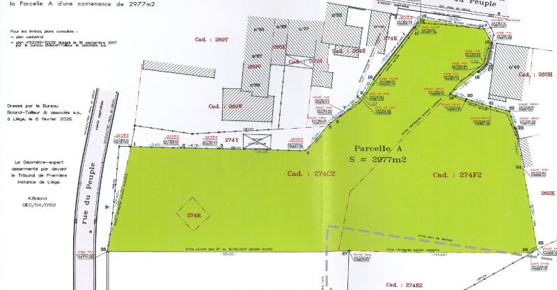 Belle parcelle de terrain d'une superficie de 2.977m² (d'après plan de géomètre récent) et 2.850m² (d'après matrice cadastrale) située entièrement en zone d'habitat à caractère rural avec deux accès bien située à Soumagne. Cette parcelle est libre de constructeur et se situe à Soumagne, rue du Peuple, entre les numéros 43 et 53. Références cadastrales: Soumagne, 1ère division Soumagne, Section B, n°274F2, 274C2, 274R. Le bien ne fait pas partie d'un lotissement, il n'y a donc pas de prescriptions propres à un lotissement, il faudra toutefois respecter les prescriptions en vigueur (communales, régionales, ...). Les frais liés à la viabilisation et aux impétrants (électricité, eau, ...) sont à charges des acquéreurs. Cette parcelle est reprise en vert sur le plan de géomètre annexé. Les limites reprises dans les photos sont données à titre indicatif. Belle opportunité! Informations données à titre indicatif et non contractuelles. www,waucomont.be